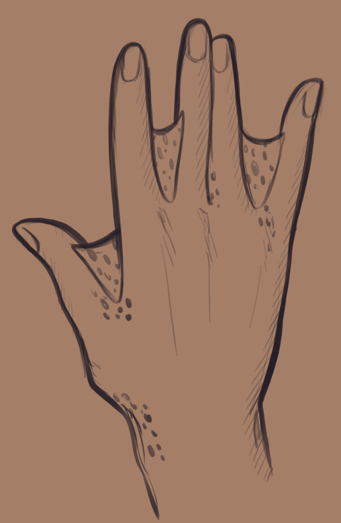 Similar to some seals or sharks, Bodren naturally develop dappled markings upon their skin which most commonly appear in a series of spots or splotches. The markings are typically a similar tone to their base complexion, but slightly shifted in hue or value. Unaltered, these typically manifest in areas of softer skin, such as the temples and ears, around the eyes, neck, palms, wrists, ankles, and groin.