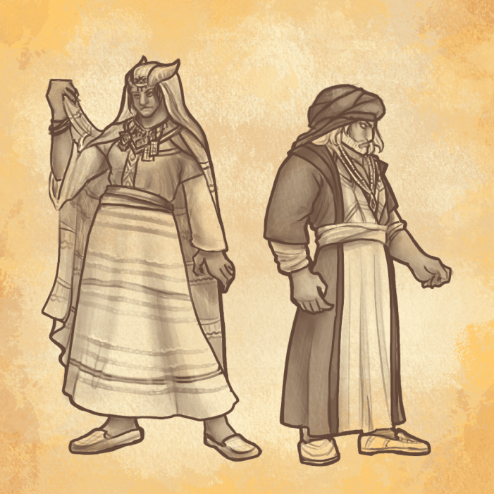 While Longwalkers tend to find solace and comfort in wearing their traditional garments, it is not always practical for them to do so in other Lands where they may find themselves. In this case, a Longwalker will often adjust their wardrobe to stay true to their original clan’s heritage, while also making appropriate cultural and functional choices that will not ostracize them from their adopted home outside the Sizzling Sands. They always keep their traditional desert garments for their ancestral pilgrimage, though, where they will be of incredible use.