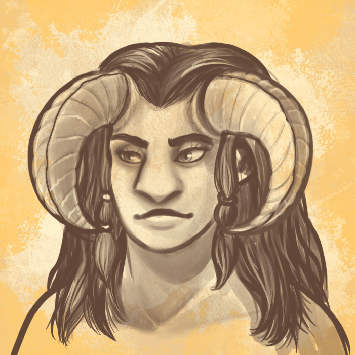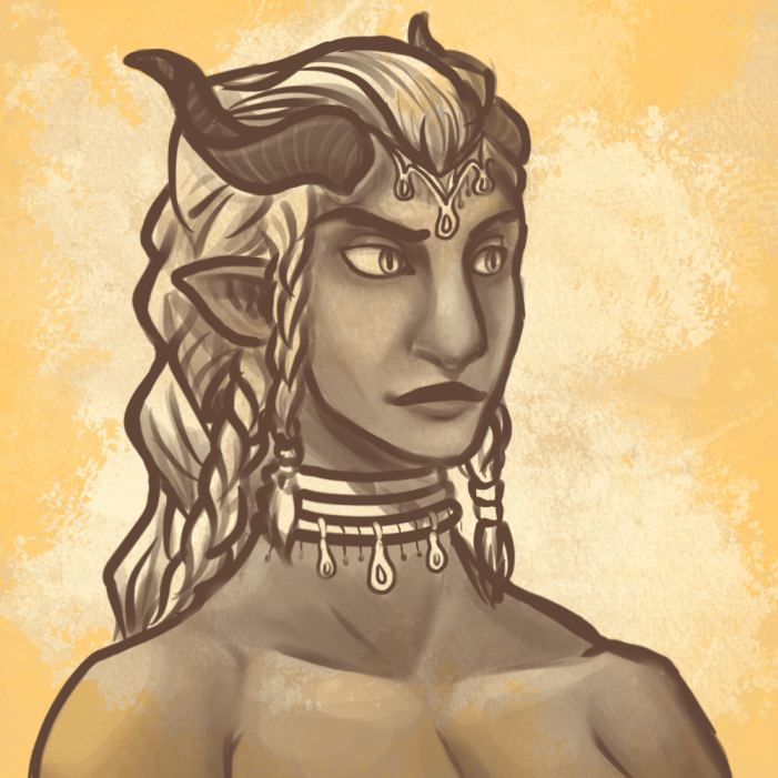 The Canzi take care in ensuring safety and comfort in a life of travel; most adults wear a long, loose-fitting unisex outer robe with full sleeves, both breathable and protecting from the harsh sun and sandy breezes. Men frequently wear a full head wrap covering down to the neck and a simple silk or hemp belt tied about the waist. Mens’ undergarments are typically white, and their robes may have a simple pattern, but any married men wear solid muted colors. Women typically wear bright patterned fabrics, including a simple head scarf or tie, and many wear equally vibrant belts, shawls, and capes. The leading women of a tribe will adorn their horns with jewelry or if capable will wear a traditional elaborate headdress comprised of precious metals, gemstones, and other exotic materials. Youths are generally allowed to dress as they please, however most are dressed to their parents taste until adulthood, around 16.