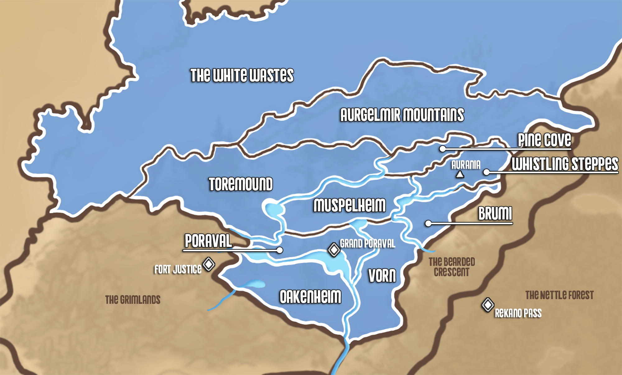 This region is the least-populated in Lovalia proper, and this is due to its lacking environment. Once it was a large sea between the Lovalian Mountains and the Bearded Crescent, but in the last millennia, Vorn has frozen solid into a punishing ice plains running north to south along its major central territory. The only truly inhabited areas are small settlements located along its borders, along the rivers and up toward Muspelheim.