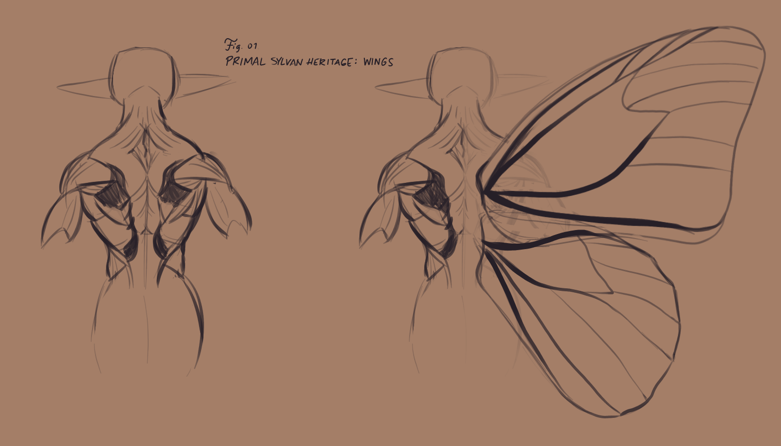 Faekin have uniquely magical wings, which can be used for long-distance flight (flight-form) as well as stabilized hovering (still-form), and they can even be manipulated to fold downward behind their back for times they need to be in enclosed or tight spaces (cloak-form).